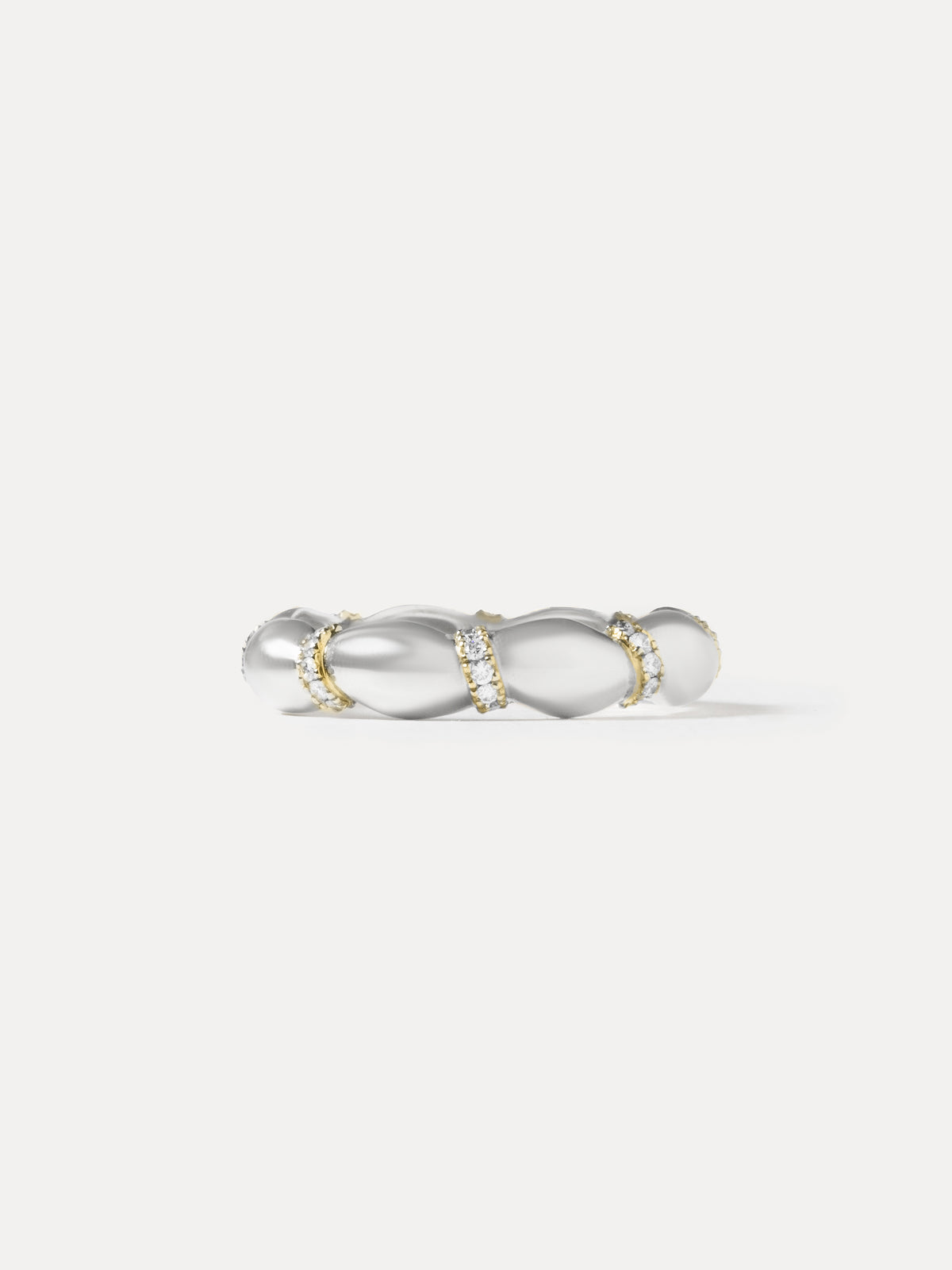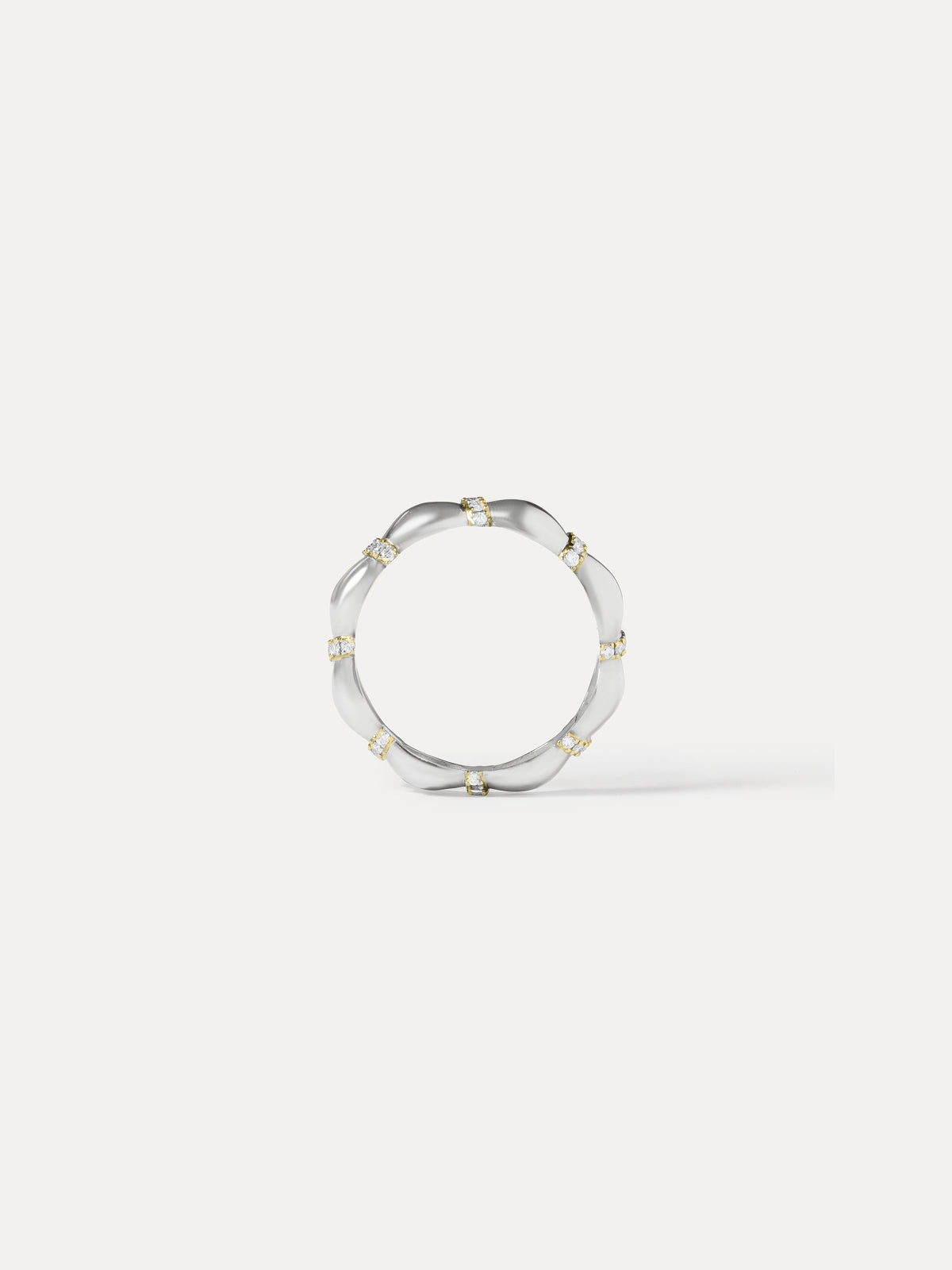 La monture se compose d’une succession de volumes galbés, alternant or blanc et or jaune. De fins anneaux sertis de diamants ponctuent la composition et viennent rythmer le mouvement de la bague. L’ensemble dessine une ligne fluide et sculpturale, évoquant un souffle continu.